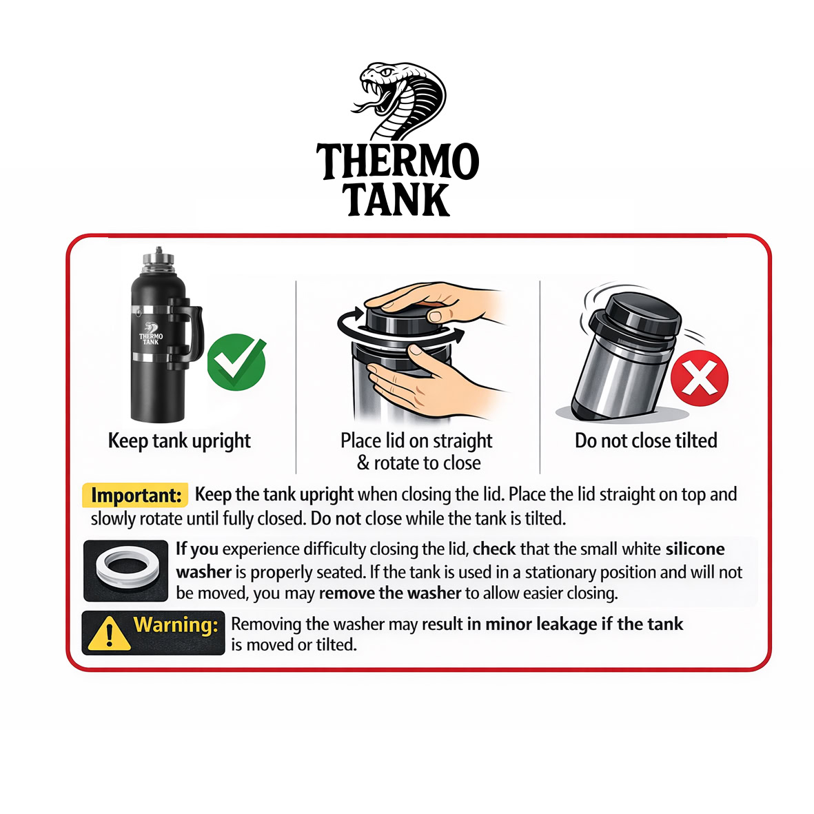 If you experience difficulty closing the lid, check that the small white silicone washer is properly seated. If the tank is used in a stationary position and will not be moved, you may remove the washer to allow easier closing.